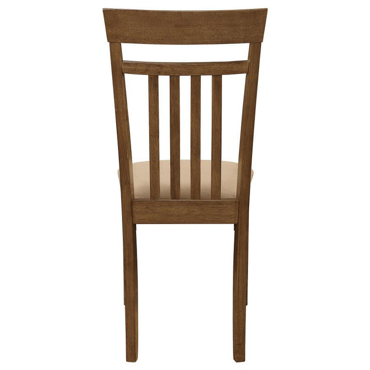Bring casual sophistication to your dining area with this five-piece dining set. The rectangular table features clean lines and tapered legs, offering a timeless look that complements transitional spaces. Each chair showcases a classic slatted back design for added support and style. Plush cushioned seats upholstered in soft beige microfiber enhance comfort. Crafted from solid rubberwood, engineered wood, and okume veneer, this dining set provides lasting beauty for everyday dining.