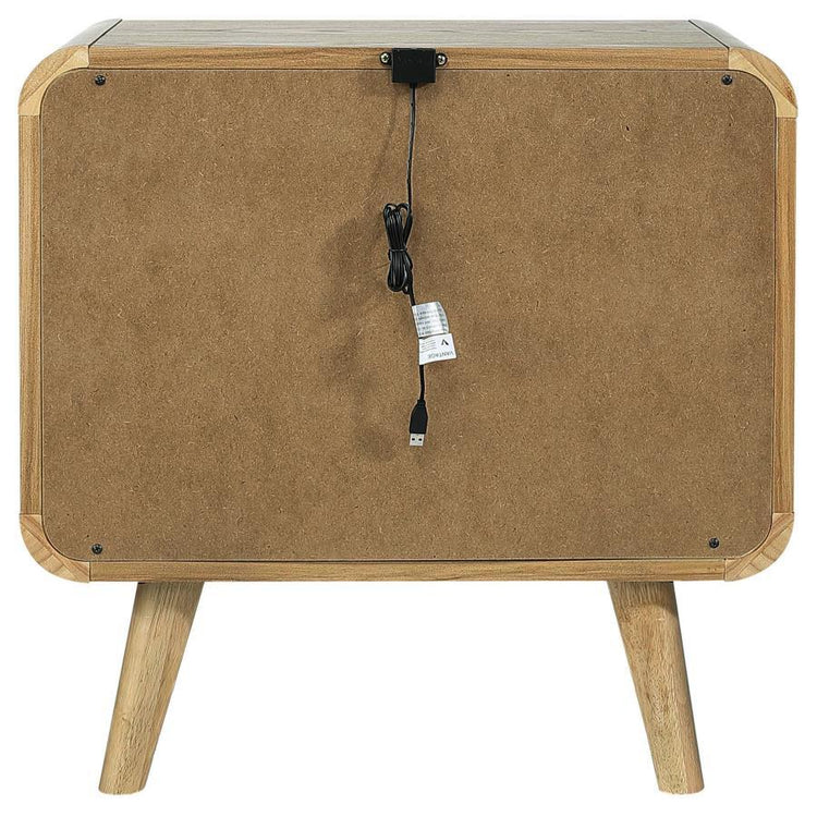 Enhance bedside functionality with this mid-century modern nightstand, crafted from pine, engineered wood, and walnut veneer for lasting durability. Featuring rounded edges, tapered legs, and a sleek silhouette, it adds a touch of retro sophistication to your space. Two spacious drawers, including a felt-lined top drawer, provide ample storage for nighttime essentials, while dual USB ports make it easy to charge your devices at the bedside.