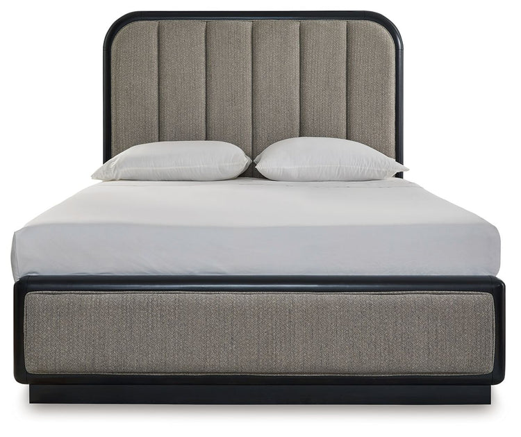 Rowanbeck - 4 Pc. - Dresser, Mirror, Queen Upholstered Panel Bed - Gray / Black