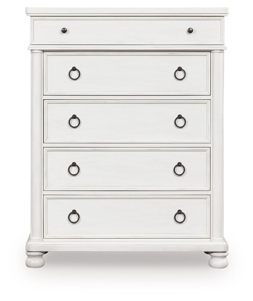 Taking a laid-back approach to casual traditional design, this artfully crafted chest of drawers combines classic elements with a clean modern approach. Its rubbed antiqued finish exudes a comfy, timeless appeal that's sure to carry you away to a dreamy time and place. Simple round metal knobs and ring pulls on the chest's spacious drawers make just the right statement.