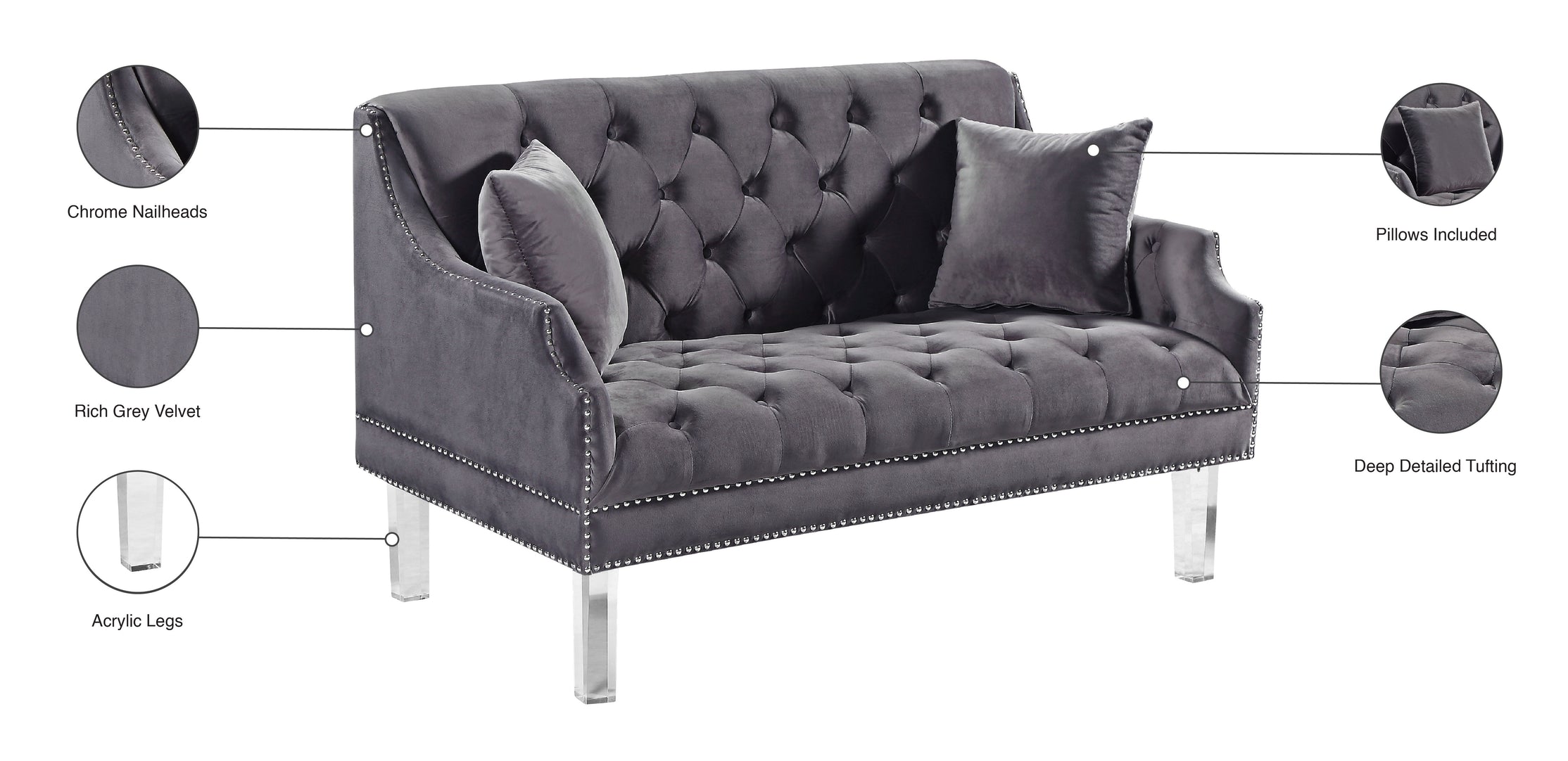 Bring a posh look home with this Roxy Loveseat. The velvet is both striking yet unobtrusive, giving your room an elegant style boost while providing you with a comfortable spot to sit and relax while reading or watching TV. Deep button tufting gives the loveseat a touch of texture while ensuring its sophistication is lost on no one. Add this contemporary loveseat on its own to your living room or den, or buy it alongside the coordinating sofa and chair for a complete and total makeover.