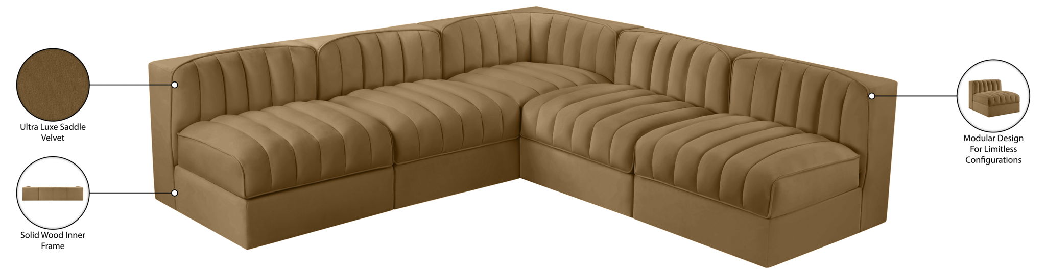 Rummi - Armless Velvet Performance Fabric Upholstered 5 Piece Modular Sectional - Saddle