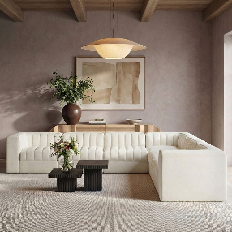 Rummi - Symmetrical Velvet Performance Fabric Upholstered 7 Piece Modular Sectional (With 3 Corner Chairs) - Cream