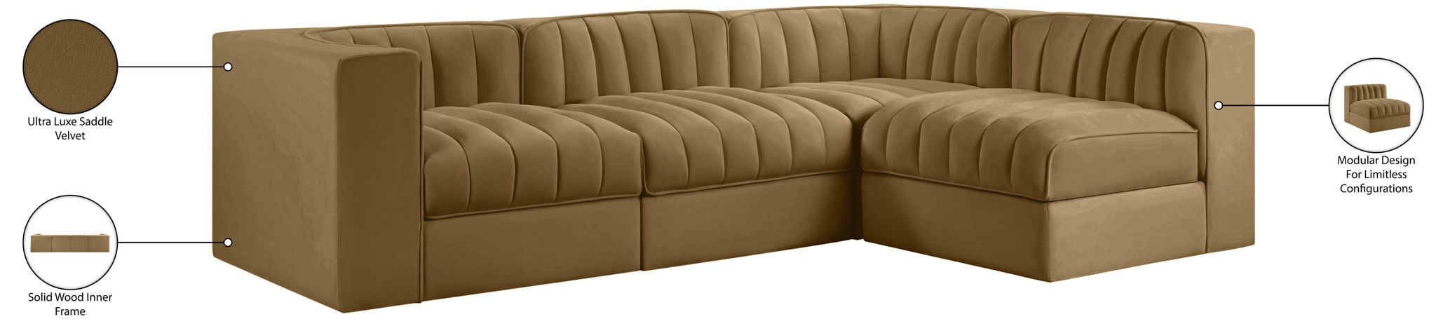 Rummi - Velvet Performance Fabric Upholstered 4 Piece Modular Sectional - Saddle