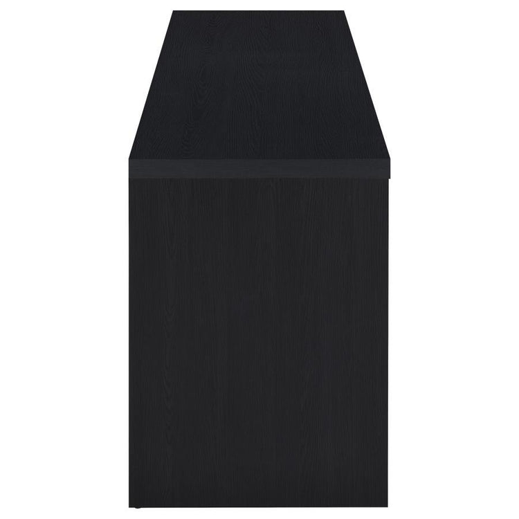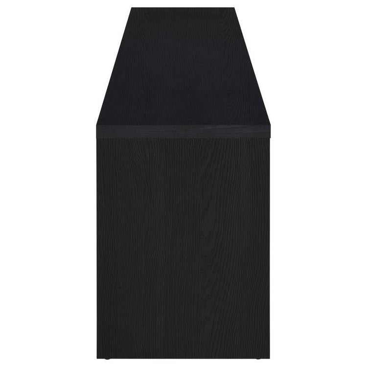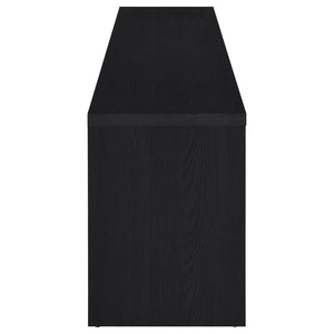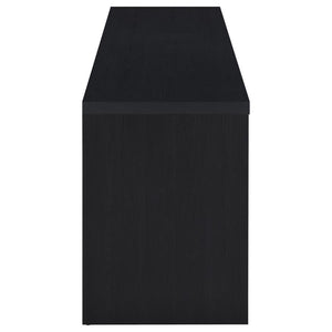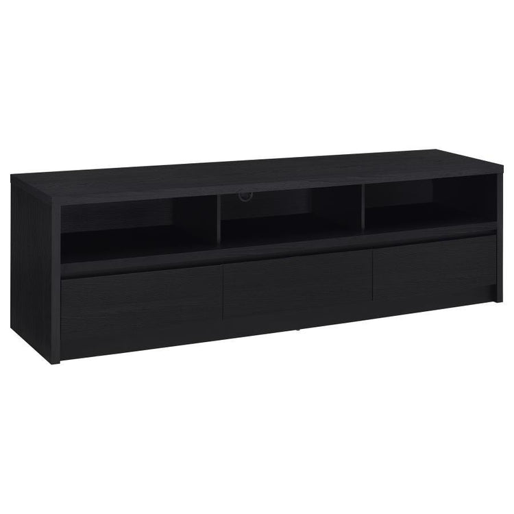 Upgrade your entertainment space with this black TV stand, crafted from engineered wood with a paper laminate veneer for durability and a sleek finish. The clean lines and modern design include open shelves for electronics, a wire management hole to reduce clutter, and three concealed drawers for organized storage. Perfect for flat-screen TVs, this media console combines style and functionality for any contemporary setup.