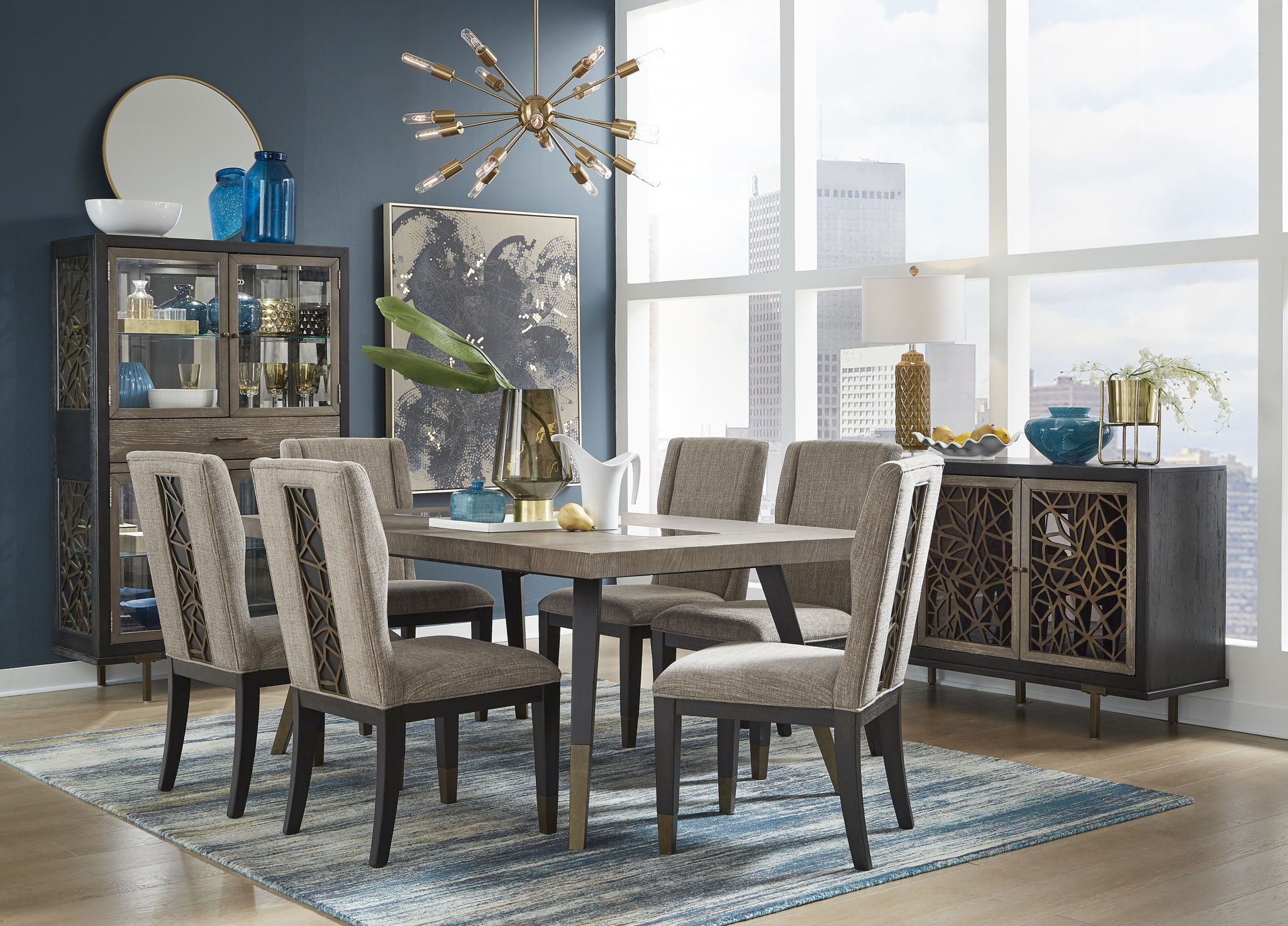 Distinctive in every way, the Ryker dining collection offers a refreshing take on dining in style. Its unique character combines a stunning mix of materials, including wood, metal and glass. It features a Nocturn Black and Coventry Grey finish that highlights its strong contemporary profiles and is accented with both black glass and clear mirror. A signature fractal pattern design element highlights select pieces and gives a distinctively modern edge to the group while metal ferrules in Aged Brass add a finishing touch to the legs. With exceptional beauty and comfort, Ryker is perfectly suited to take a dining room from unremarkable to truly remarkable.