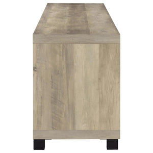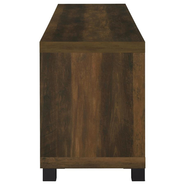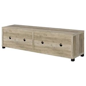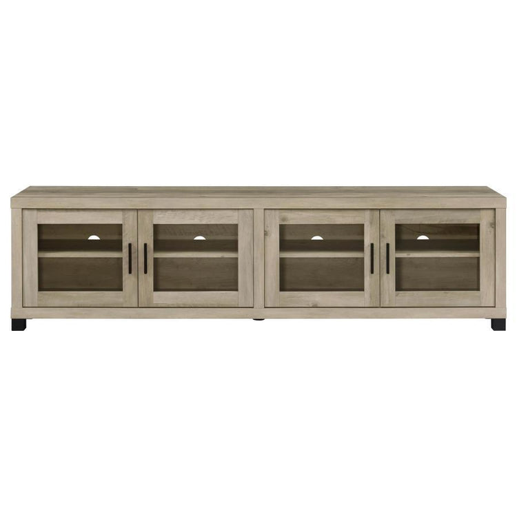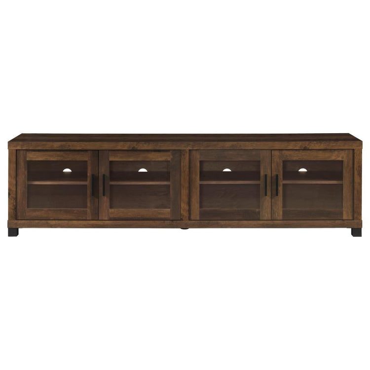 Elevate your living area with our rustic urban TV stand, a perfect blend of timeless aesthetics and modern functionality. Highlighted by striking black hardware accents, this piece boasts four ample compartments that ensure your media devices are organized and easily accessible. A sophisticated glass door juxtaposed with fixed shelves adds both style and practicality. For those seeking added storage and a cohesive look, pair this stand with our matching media towers. The stand's boxy silhouette, complemented by smooth surfaces and versatile adjustable shelves, offers a contemporary touch, ensuring it's not just a furniture piece but a statement of design excellence.