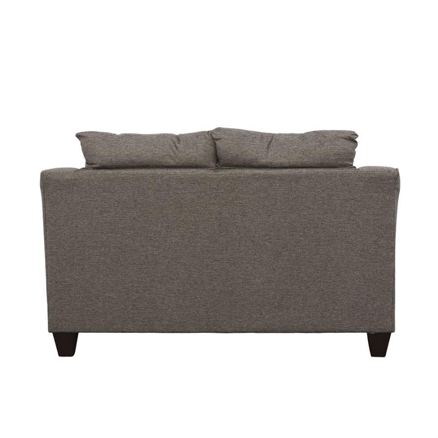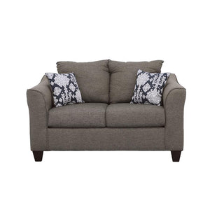 Infuse your living room with understated glamour. The cool, casual design of this classic loveseat adds an element of traditional style to any home. Warm, neutral, grey upholstery is accentuated by contrasting accent pillows. Its sturdy frame is topped with high-density, full-foam seat cushions for firm, comfortable support. Pair this loveseat with a matching sofa to create an inviting atmosphere in any home.