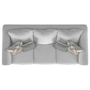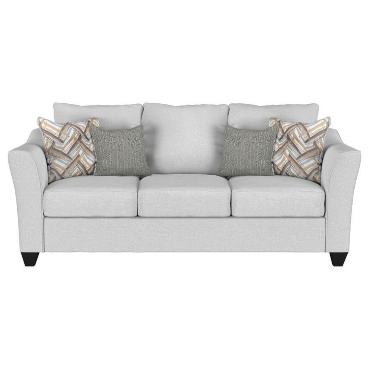 Elevate a living room with casual style and subtle sophistication. This classic sofa boasts a simple silhouette enhanced by elegant, flared arms. Neutral, warm grey upholstery lends a touch of subdued glamour. High-density, full-foam cushions offer an exquisite level of comfort. Complete with contrasting accent pillows, this sofa has all you need for day after day of cozy relaxation.