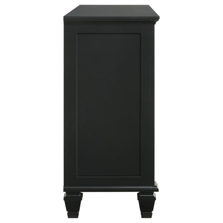 Bring both elegance and ample storage to your bedroom with this beautifully crafted dresser, featuring 11 spacious drawers and two wood-framed tempered glass doors. The mix of drawers and glass-paneled cabinets offers a perfect blend of functionality and display options. Felt-lined top drawers provide a safe space for delicate items, while the English dovetail joints and metal extension glides ensure smooth and durable drawer operation. The two wood-framed tempered glass doors reveal additional shelving for showcasing your favorite decor or accessories. Constructed from solid hardwood and engineered wood, this dresser boasts durability and timeless appeal. Finished in a neutral color with brushed nickel hardware, it adds a refined touch to any bedroom setting.