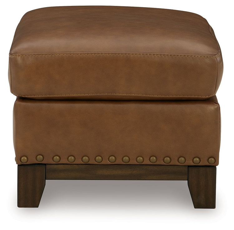 Effortlessly blending contemporary and classic elements for a truly timeless look, this ottoman offers a fresh take on transitional style. Its robust silhouette is coupled with skillfully matched leather and faux leather upholstery, while nailhead trim offers a touch of subtle sophistication. A pleasingly plump cushion with jumbo stitching provides exceptional comfort. We’re all in—how about you?