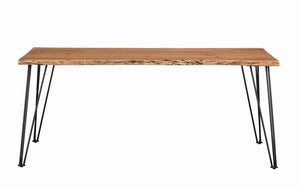 An interesting take on industrial modern design, this rectangular dining table is full of bold visuals. Constructed of wood, the table top showcases a distressed natural acacia finish that reveals the wood grain. Dark hues are exposed along the sides of the rustic top, matching the deep gunmetal finish of the legs. Sleek and contemporary, an open hairpin leg design is made with thin lines of metal. Elevated and open, this charming table adds a cozy feel while maintaining a clean and up-to-date feel.