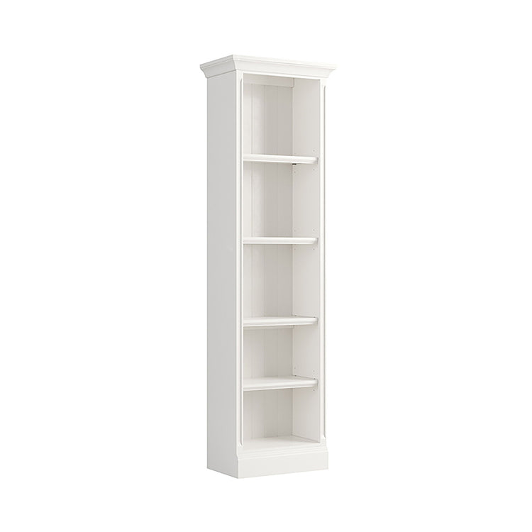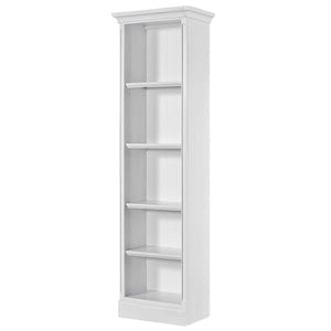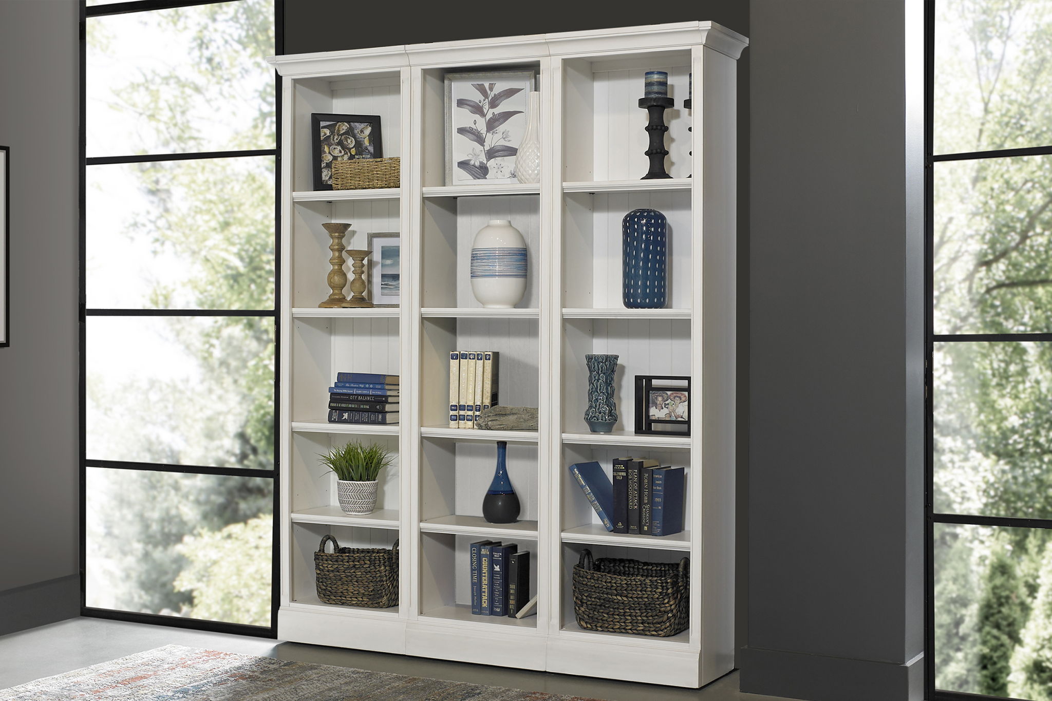 This bookcase provides the perfect blend of style and functionality. The gorgeous effortless white finish over birch veneers is contrasted by a medium roast brown finish and accented with burnished nickel hardware, creating a unique and eye-catching piece that is sure to elevate any room. The back panels can be reversed for two distinct looks, and the removable side crown moldings allow bookcases to be bunched together for a more customized and cohesive look. Whether you're using it in your living room, home office, or bedroom, our bookcase provides ample storage space for your books and decor while adding a stylish touch to your home.