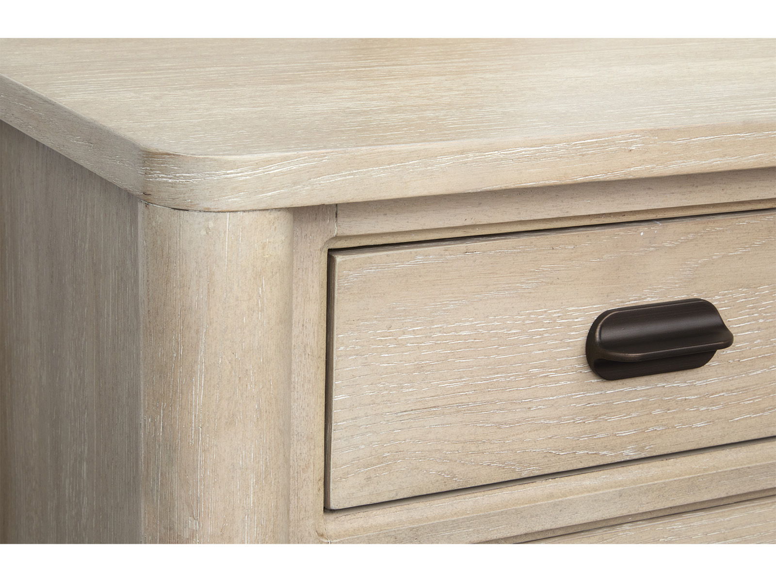 Design your ultimate bedroom retreat with the fresh and easy going character of the Sunset Cove bedroom collection. Simplified shapes and rounded forms and softly curving corners define the character of these captivating designs. Each piece is expertly crafted of Cathedral White Oak veneer with hardwood solids and finished in a light and natural shade of Sanibel Brown accented with Dark Bronze hardware. Start with one of its statement-making beds to create a focal point and then choose your favorite storage pieces. With understated elegance and the group offers smart storage options distinguished by features such as paper cord-wrapped decorative accents and open and closed storage and and metal accents. An honest and straightforward expression of good design and Sunset Cove is hard to surpass.