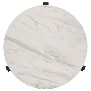Elevate your living space with this modern end table, featuring a minimalist design. Its slim black solid rubberwood legs form a tripod-like base, supporting a round top with a faux white marble-inspired finish. The high-pressure laminate surface has a textured feel with natural striations, combining durability and elegance. Scratch-resistant, burn-proof, and break-proof, this end table offers a sturdy and stylish spot for decor, lighting, or essentials.