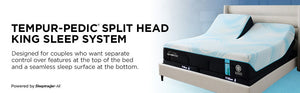 The Tempur-Pedic® Tempur-LuxeBreeze® Split Head King Sleep System helps you sleep up to 10° cooler* and provides separate controls for features at the top of the bed, including lumbar support, massage features, head positioning, and industry-leading Snore Response™,* while maintaining a seamless sleep surface at the bottom to ensure premium comfort for both sleepers.
