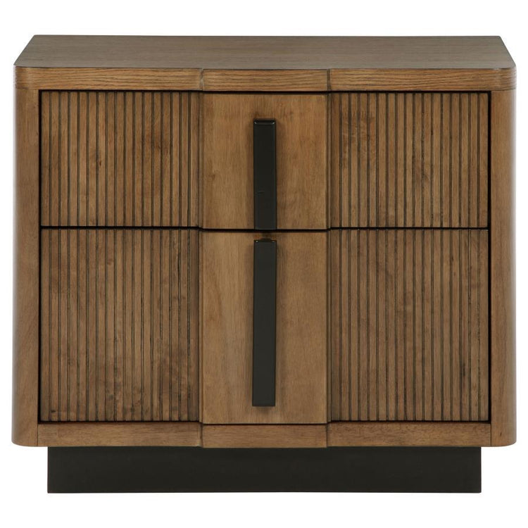 Introduce a decorative touch and plenty of convenience with a modern two-drawer nightstand. Crafted in wood, it receives a cool ash brown wood grain finish with distinctive dark drawer pulls and a matching recessed base. The drawers offer ample storage at your bedside, while the nightstand's top creates the perfect spot for a reading lamp and a choice of great books or decor. The drawer fronts feature vertical fluting that's echoed in its bar pulls, creating a sense of movement and depth. The case is complete with rounded front corners for a seamless presentation at your bedside.