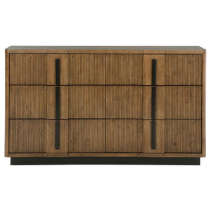Add a stylish platform for decor and ample storage for clothing with a modern six-drawer dresser. Crafted with a cool ash brown wood grain finish, the dresser features decorative drawer fronts that turn it into a true show piece in your bedroom. Drawer fronts are subtly shaped and paired with vertical fluting that creates chic depth in an artful presentation. Thick bar pulls are turned vertical, echoing the elegant lines of the piece. Its wide top is just right for a jewelry box and decor, offering a personalized ambiance to your bedroom.