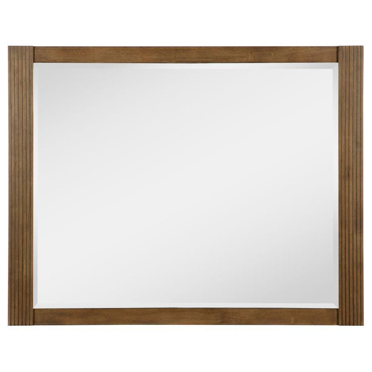 Offer a tailored touch to your bedroom with a modern framed dresser mirror. It mounts directly to the back of the dresser, offering reflectivity and lightness to surrounding decor. The mirror frame boasts a cool ash brown wood finish and features vertical fluting on its left and right sides. Beveled glass creates dimensionality and offers a refined touch of style. Add decor to complete the look of your stylish dresser.