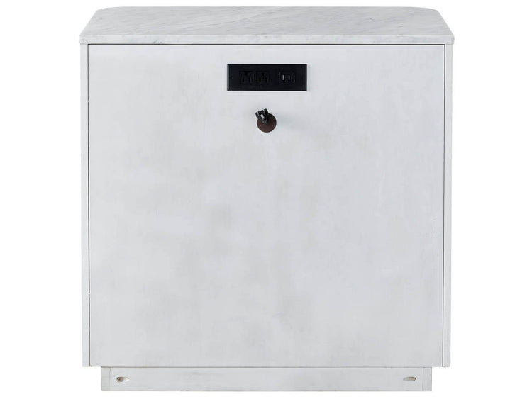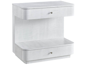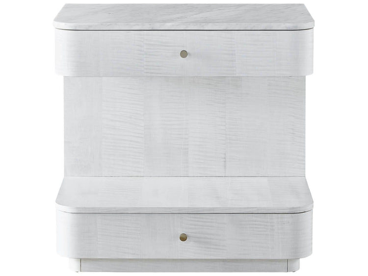 Elevate bedsides with the imaginative Paris Nightstand, a stylish twist on a retro look featuring two drawers, white marble tops and a lavish white sycamore finish.
