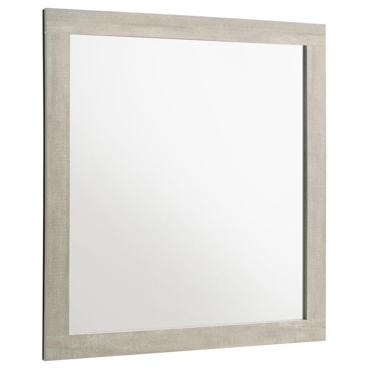 This contemporary mirror adds a refined touch to any bedroom with its clean, minimalist frame and rustic cream finish. Crafted with a rough-sawn, white-washed engineered paper veneer, it complements the dresser with its understated elegance. The mirror not only enhances the room’s brightness but also adds a sense of depth, making spaces feel more open and inviting. Perfectly suited for modern and rustic-inspired interiors, this mirror is the ideal finishing piece for a well-rounded bedroom setup.