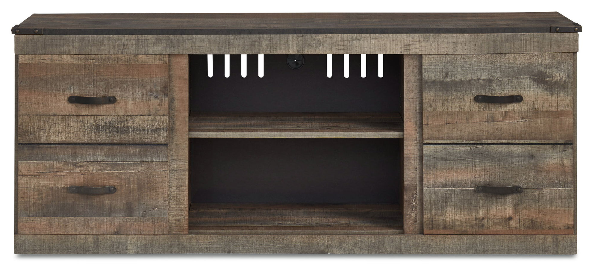 Entertain a rugged yet refined sense of style with this TV stand. Rustic finish and plank-style details pay homage to reclaimed barn wood, while faux metal banding with nailhead accents infuses a touch of industrial cool. Ultra clean lines ensure a look that can go from the country to the city and feel equally at home. Opt for the optional fireplace insert (sold separately) for added warmth.