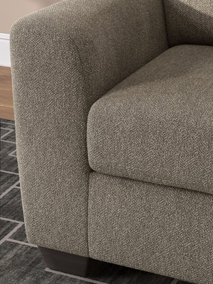 Transitional and right on trend. This oversized chair's upholstery is a delightful change from the ordinary, with hints of soft brown giving the gray hue added depth. It’s punctuated with a chic accent pillow in an eye-catching, stylized stripe design. Whether you're hosting friends and family or relaxing solo, this chair invites homey, comfortable character into your space.