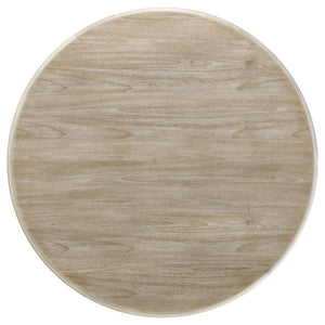 Create a welcoming, warm ambiance for meals with the family with this five-piece modern dining set. A chic blend of contemporary and casual styles, it features wood construction with a wire brushed, whitewashed finish that's light and fresh in a kitchen or dining room. The set features a round table with a distinctive pedestal base that features four curved legs on a round, stepped disc base. Four stylish side chairs accompany the table, featuring plush foam padding and light beige upholstery that complements the wood finish perfectly. Chairs have full, padded backs, perfect for leisurely dining with friends and family.