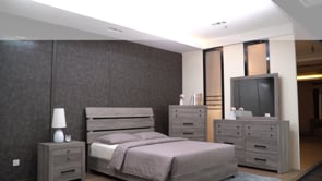 This bedroom set presents a harmonious blend of rustic charm and streamlined design, showcasing a weathered gray finish that brings a tranquil, grounding atmosphere to any sleeping space. The ensemble includes a robust bed frame with a striking headboard that makes a solid statement, alongside matching pieces that balance functionality with aesthetic appeal. Each item, from the sturdy dresser to the sleek nightstands, features clean lines and discreet metal handles that add a modern touch to the rustic texture.