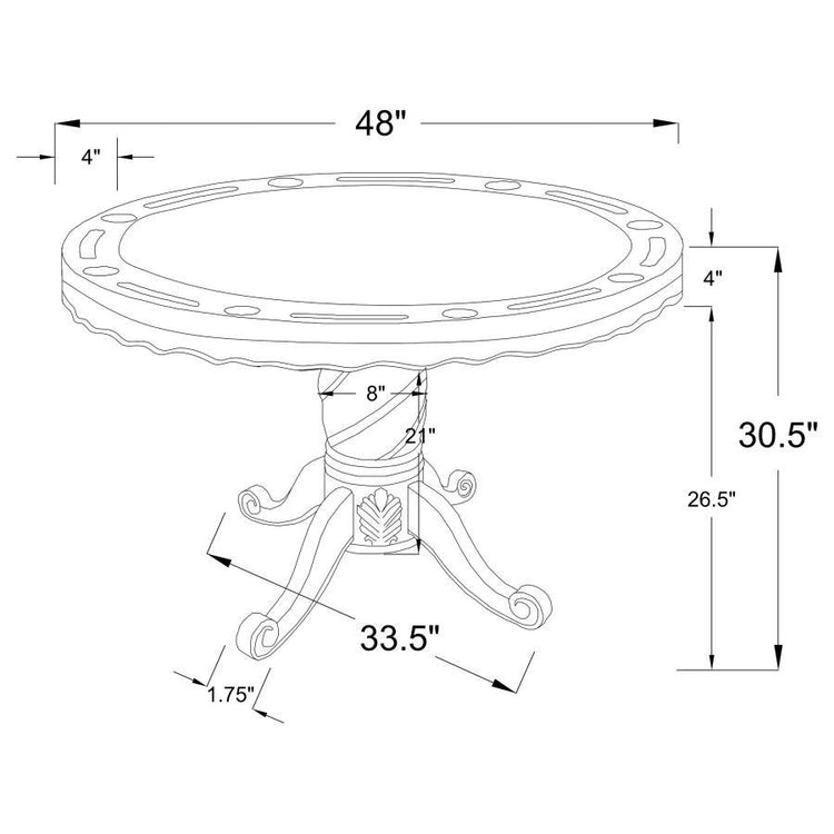 The classic silhouette from this five-piece dining set is perfect for a versatile space. Dine, or play poker or bumper pool with the three-in-one rounded game and dining top. In a warm, deep finish, this Craftsman-inspired set is complete with four chairs and pool sticks and balls. Constructed of solid oak, the arm chairs feature plush cushioning and casters. Fun and comfortable with delicate details, this set marries sophistication with playfulness.