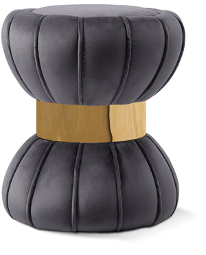 Add modern sophistication to your living space with this chic velvet Vino ottoman stool. Plush velvet curves are bound by a stainless steel band in its center, creating an hourglass shape that is edgy and complements your contemporary home decor.