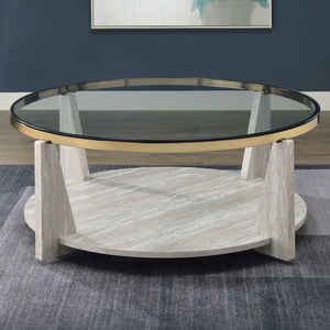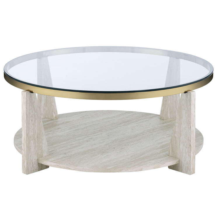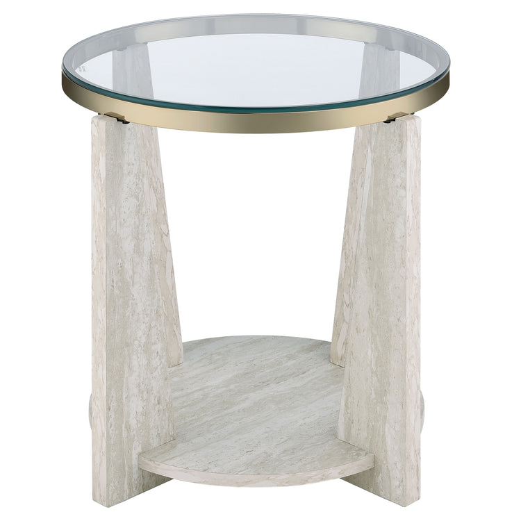 With its modern profile round shape, the Wanda Glass Top Table is a stylish accent for any living room. The tempered glass top offers an elegant surface for a lamp or decor, while the lower shelf provides extra display space. A satin brass band adds a touch of luxury, complementing the faux stone base for a high-end look at an affordable price.