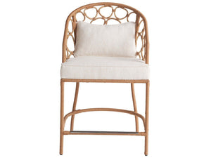 Rattan is woven into a series of circles, creating a soothing pattern in the Pebble Counter Stool. The stool also features an upholstered seat and kidney pillow for added comfort and style.