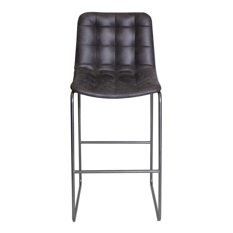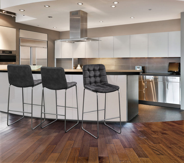 Westover presents a modern look with a retro feel in a comfortable upholstered Counter Stool. Designed to fit 42-inch high counters, this sporty chair features a buttonless tufted seat and back in a charming charcoal leatherette that adds a modern touch to a classic upholstered design. The cold-rolled steel base is lightweight but heavy duty and creates a frame that is sturdy but compact.
