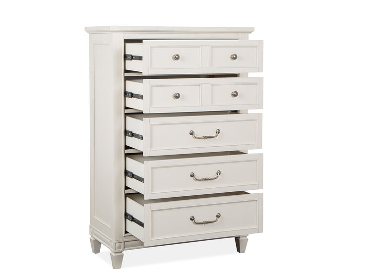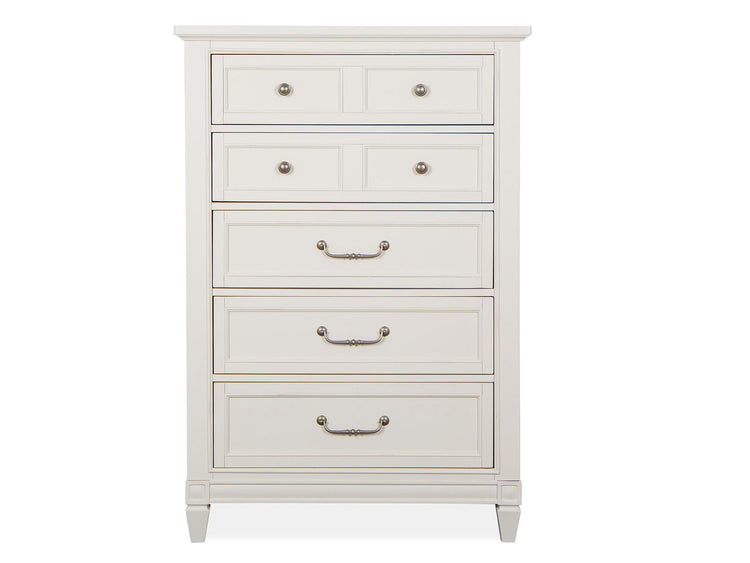 Charming and chic and Willowbrook combines a soft and casual Egg Shell White finish with classic forms to create a soothing atmosphere that relaxes mind and body. Create a serene setting with vintage silhouettes featuring breakfront shaping on the dresser and panel headboard and mirror and and tarnished silver hardware including a decorated knob and elegant bail pull. Crafted from Birch veneers and hardwood solids with a subtle gray wash over the creamy finish and Willowbrook is at home in settings from cottage to coastal and from traditional to soft modern. The stunning panel bed has a storage footboard option with two drawers and is also available with a wood-framed upholstered headboard. Two nightstand options are offered including a two-drawer nightstand and a one-drawer nightstand with two shelves. The functional door chest has a sliding wood door with wood shelves behind and five left drawers with a felt-lined top drawer and one bottom drawer to maximize storage. From beaches to the countryside and Willowbrook is a relaxing destination for the end of each day’s journey.