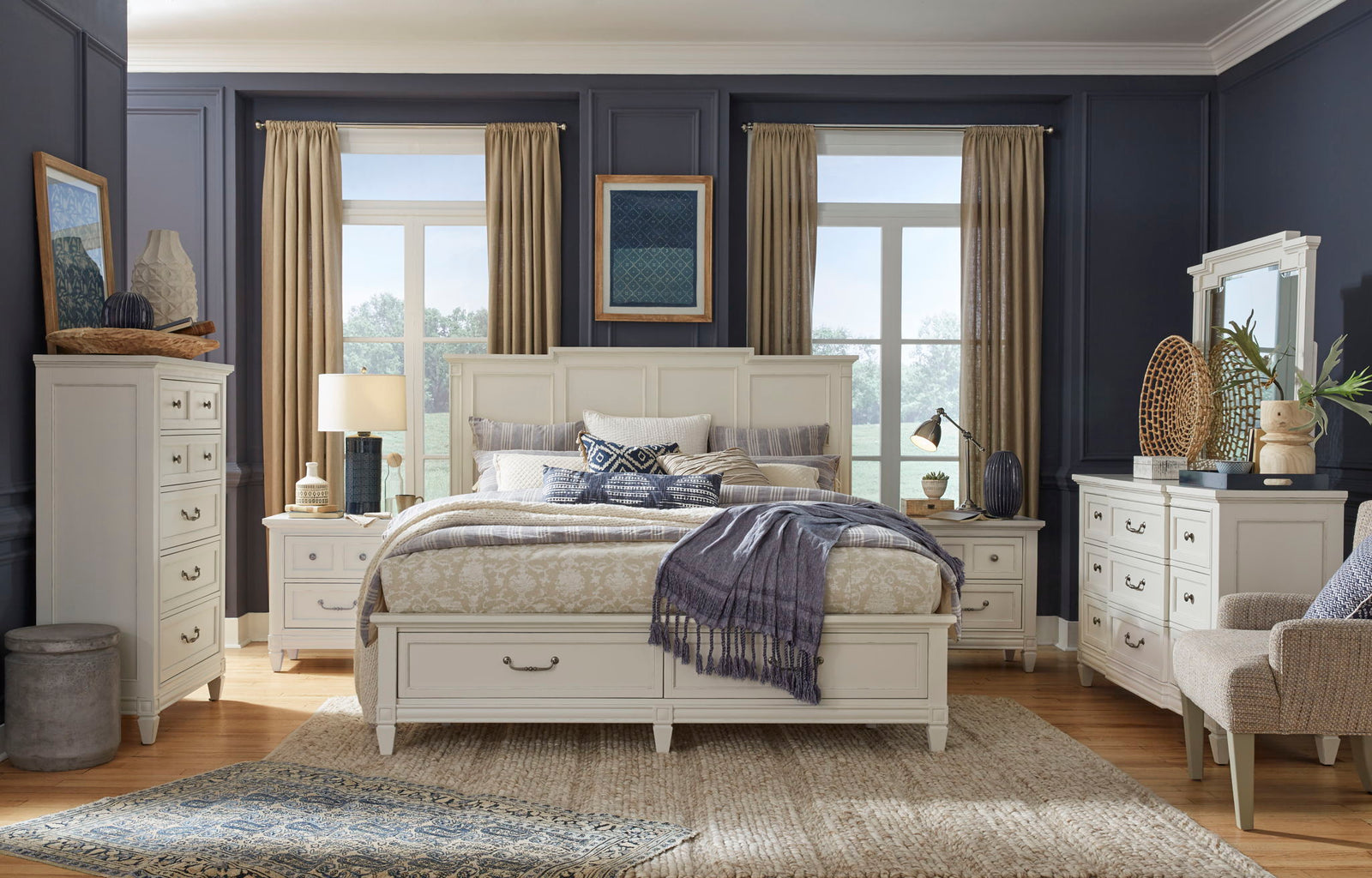 Charming and chic and Willowbrook combines a soft and casual Egg Shell White finish with classic forms to create a soothing atmosphere that relaxes mind and body. Create a serene setting with vintage silhouettes featuring breakfront shaping on the dresser and panel headboard and mirror and and tarnished silver hardware including a decorated knob and elegant bail pull. Crafted from Birch veneers and hardwood solids with a subtle gray wash over the creamy finish and Willowbrook is at home in settings from cottage to coastal and from traditional to soft modern. The stunning panel bed has a storage footboard option with two drawers and is also available with a wood-framed upholstered headboard. Two nightstand options are offered including a two-drawer nightstand and a one-drawer nightstand with two shelves. The functional door chest has a sliding wood door with wood shelves behind and five left drawers with a felt-lined top drawer and one bottom drawer to maximize storage. From beaches to the countryside and Willowbrook is a relaxing destination for the end of each day’s journey.