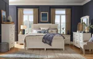Charming and chic and Willowbrook combines a soft and casual Egg Shell White finish with classic forms to create a soothing atmosphere that relaxes mind and body. Create a serene setting with vintage silhouettes featuring breakfront shaping on the dresser and panel headboard and mirror and and tarnished silver hardware including a decorated knob and elegant bail pull. Crafted from Birch veneers and hardwood solids with a subtle gray wash over the creamy finish and Willowbrook is at home in settings from cottage to coastal and from traditional to soft modern. The stunning panel bed has a storage footboard option with two drawers and is also available with a wood-framed upholstered headboard. Two nightstand options are offered including a two-drawer nightstand and a one-drawer nightstand with two shelves. The functional door chest has a sliding wood door with wood shelves behind and five left drawers with a felt-lined top drawer and one bottom drawer to maximize storage. From beaches to the countryside and Willowbrook is a relaxing destination for the end of each day’s journey.