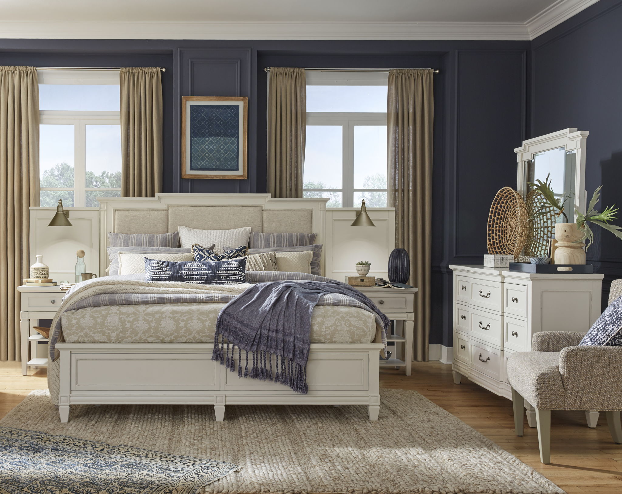 Charming and chic and Willowbrook combines a soft and casual Egg Shell White finish with classic forms to create a soothing atmosphere that relaxes mind and body. Create a serene setting with vintage silhouettes featuring breakfront shaping on the dresser and panel headboard and mirror and and tarnished silver hardware including a decorated knob and elegant bail pull. Crafted from Birch veneers and hardwood solids with a subtle gray wash over the creamy finish and Willowbrook is at home in settings from cottage to coastal and from traditional to soft modern. The stunning panel bed has a storage footboard option with two drawers and is also available with a wood-framed upholstered headboard. Two nightstand options are offered including a two-drawer nightstand and a one-drawer nightstand with two shelves. The functional door chest has a sliding wood door with wood shelves behind and five left drawers with a felt-lined top drawer and one bottom drawer to maximize storage. From beaches to the countryside and Willowbrook is a relaxing destination for the end of each day’s journey.