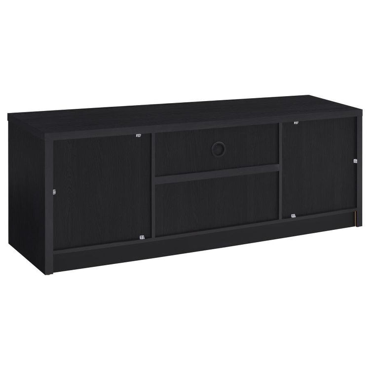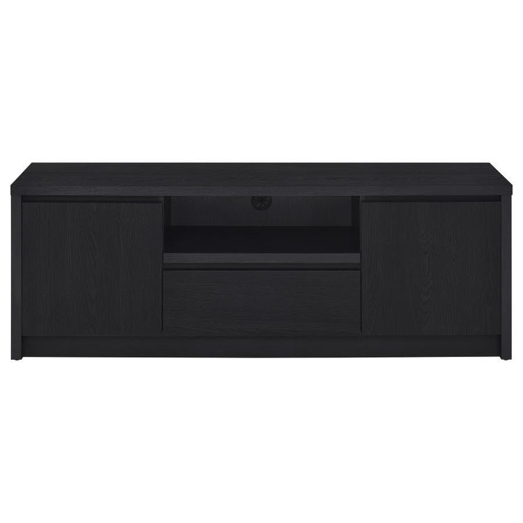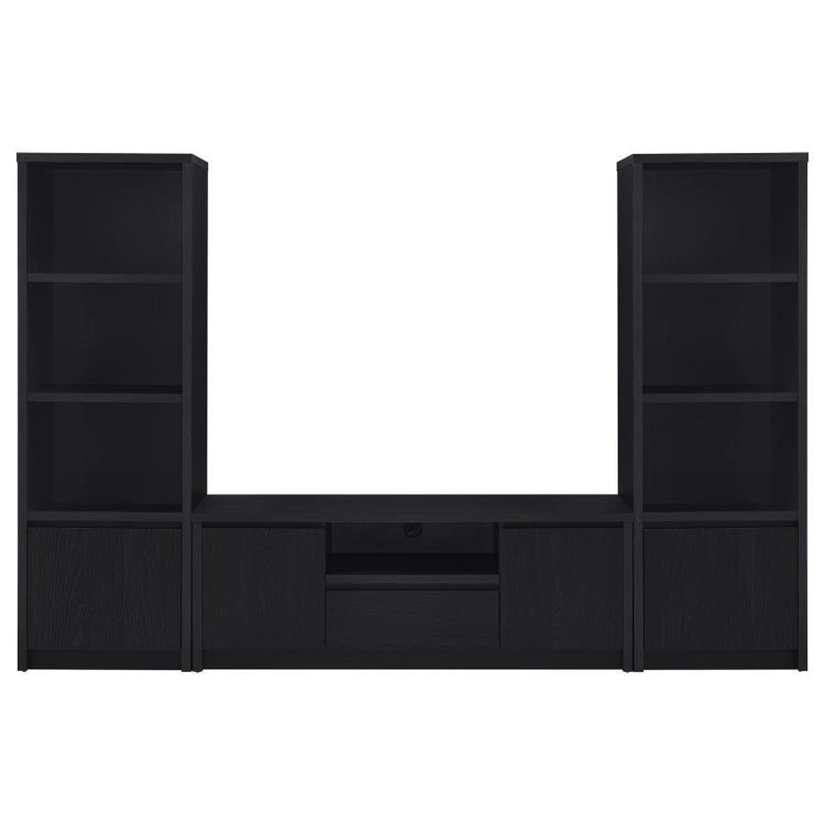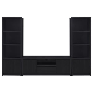 This modern entertainment center combines a sleek TV stand with two matching media towers, offering style and functionality. Finished in a bold black with a scratch-resistant eco-friendly laminate veneer, this unit provides ample storage and display options. The TV stand features cabinets, an open shelf with cable management, and a wide drawer, while each media tower includes open shelves and a bottom cabinet for organized storage. Perfect for creating a cohesive entertainment space in any living room.