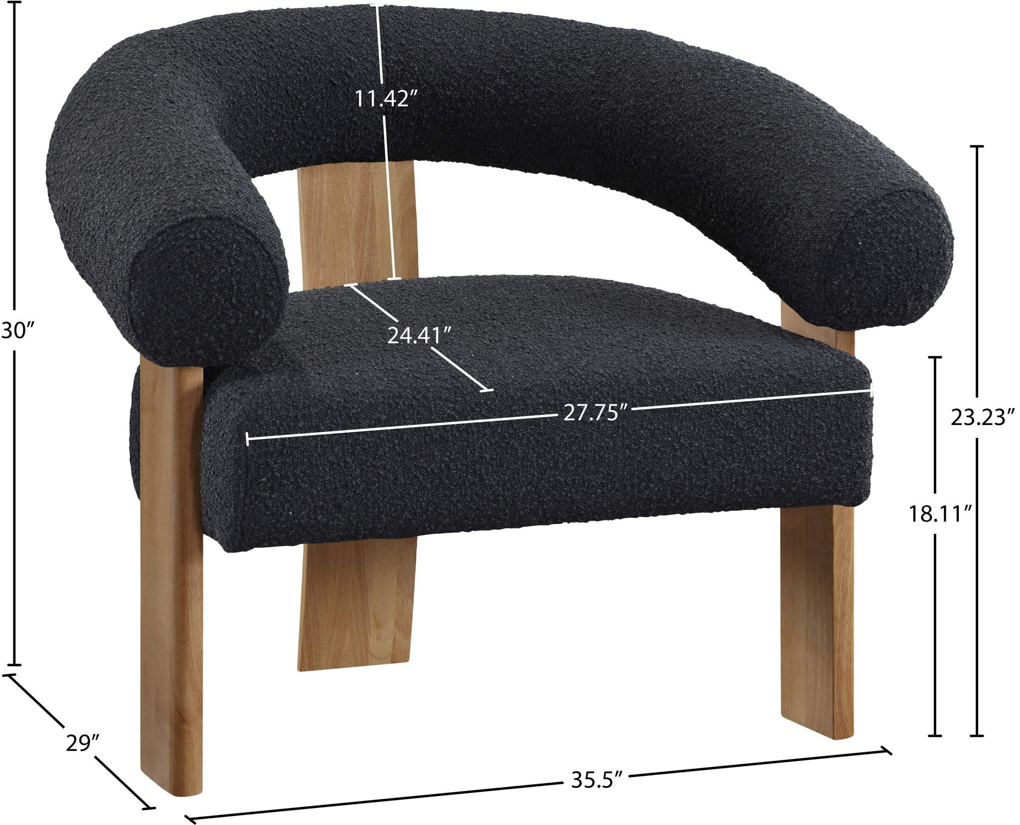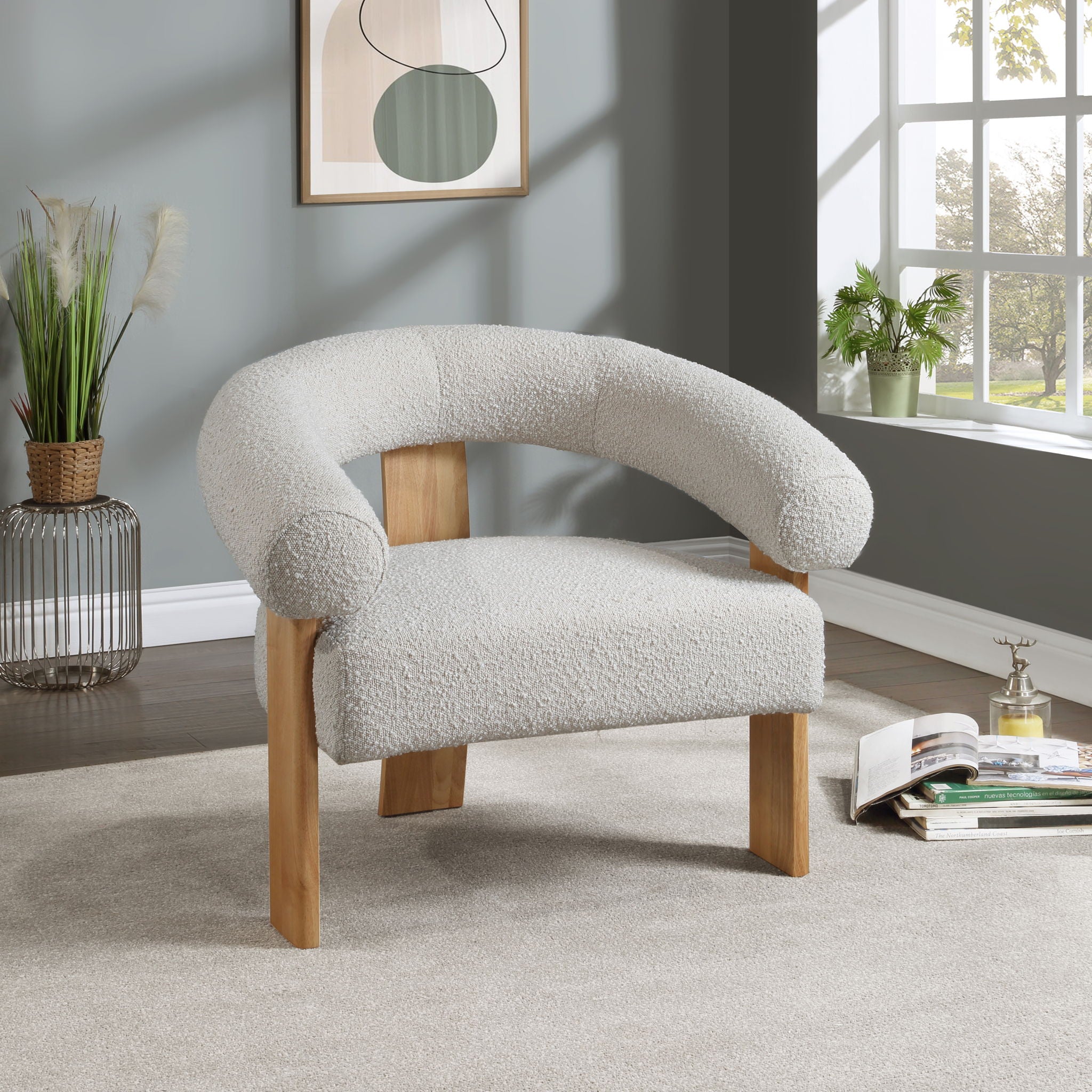 Give your room a distinctly modish look when you bring home this Winston boucle fabric accent chair. This handsome chair has a true mid-century modern design with its rounded back and wooden frame. Boucle fabric is soft to the touch and durable too, so it gives the chair longevity and resistance to damage. Solid wooden legs form a strong foundation for this pretty seat that's perfect for the living room, bedroom or other area.