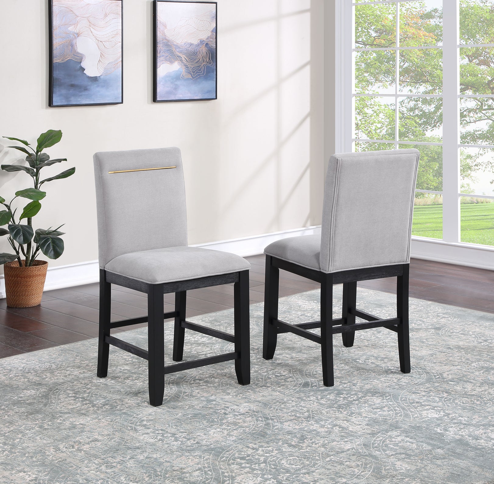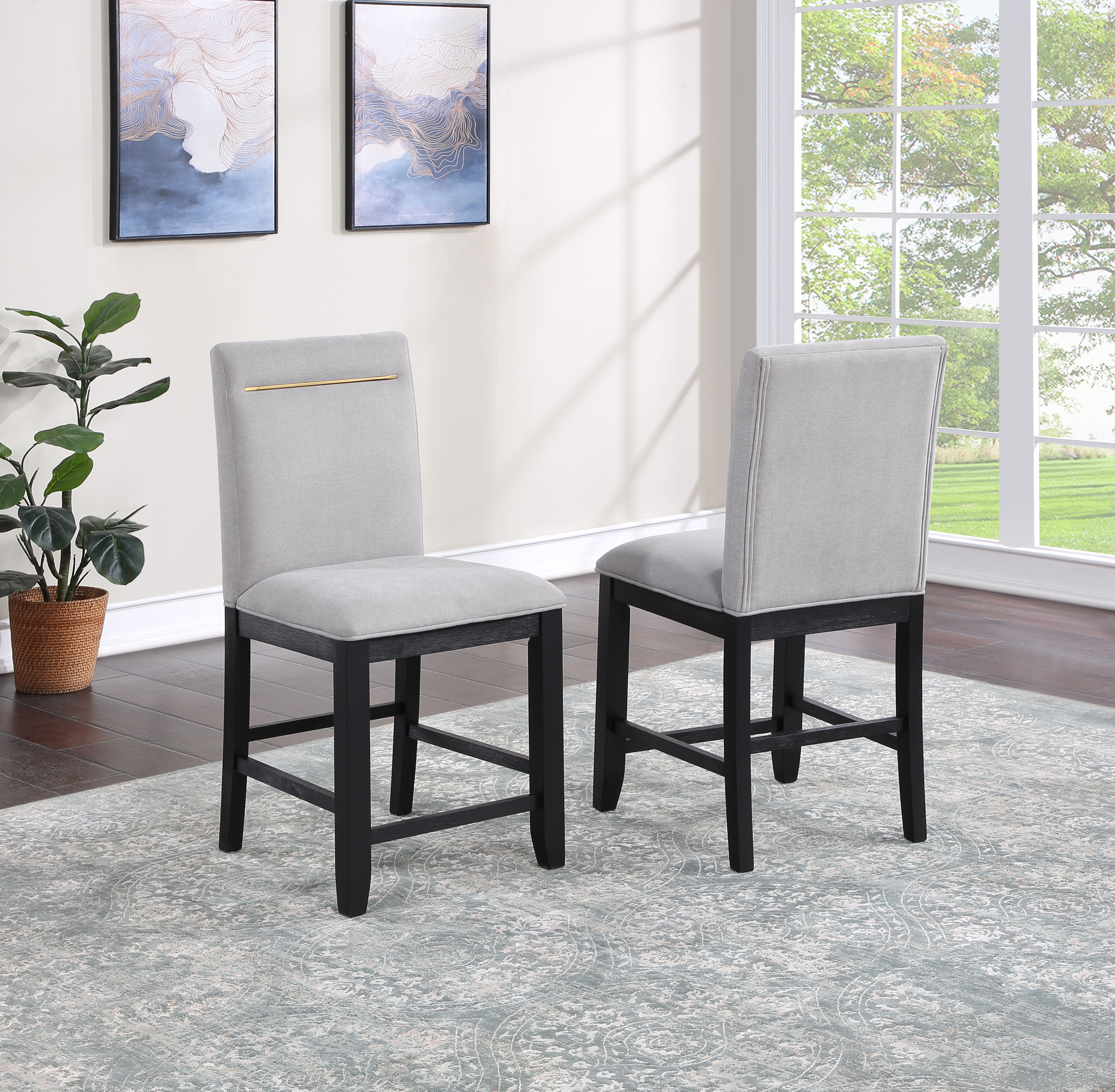 This dining set combines style and storage in one beautiful package. Crafted of acacia veneers and hardwood solids in a lustrous charcoal finish, the Counter Storage Base offers both display and storage with the clean modern lines you will appreciate. Brushed brass accents offer a great complement to the Charcoal finish and are featured on hardware and on the back of the performance fabric chairs. The Counter Height table, chairs and bench are a wonderful height for sitting and working and the seating can also be used on 36-inch height counters. Yves shows you do not have to sacrifice function for style in this Counter Height Dining ensemble!
