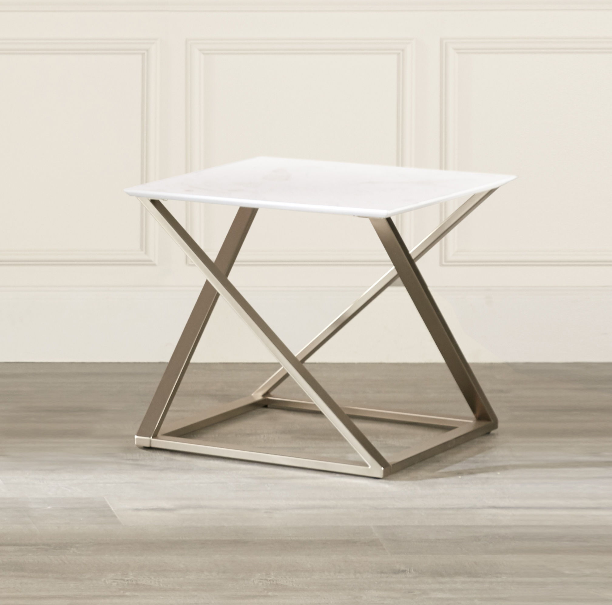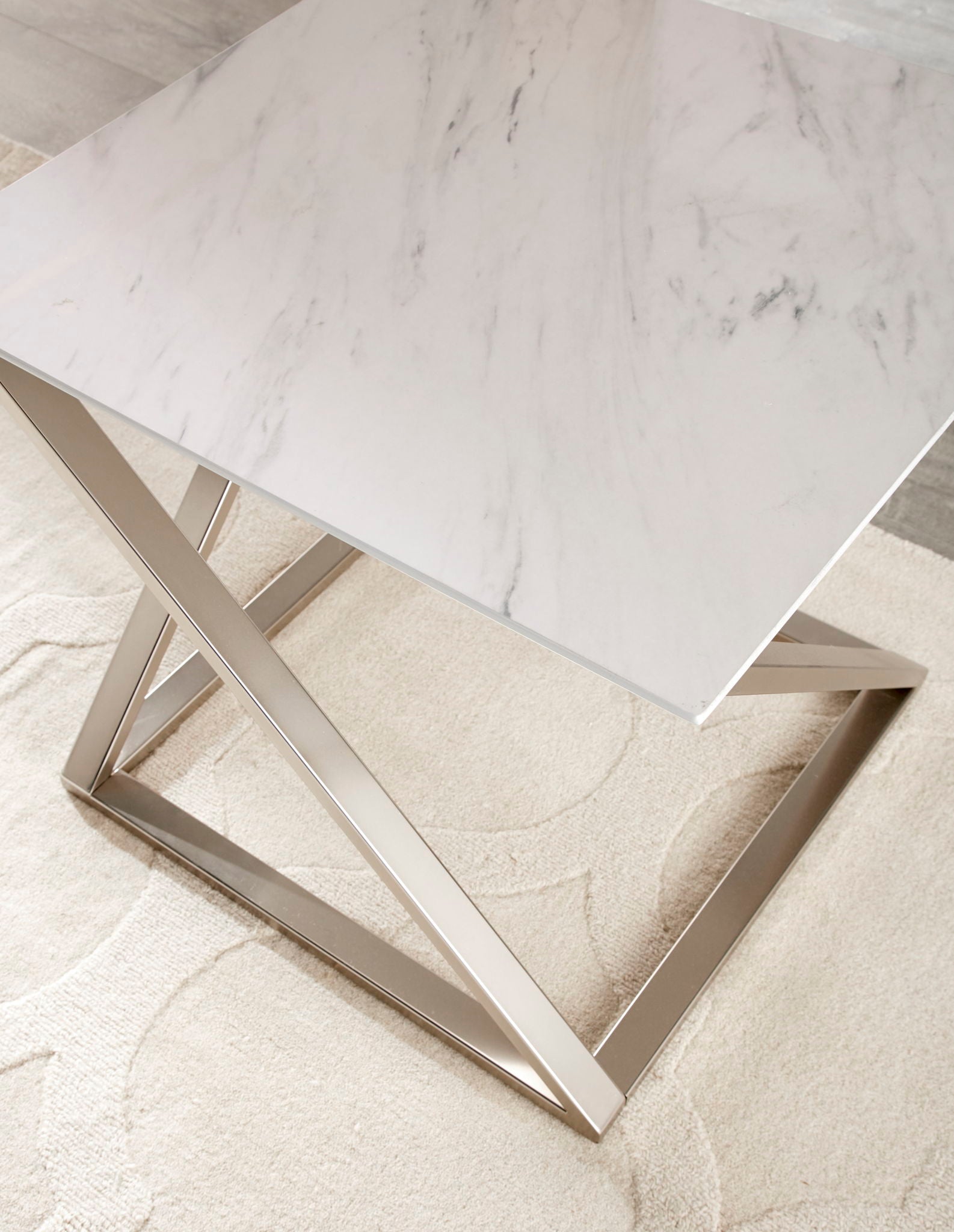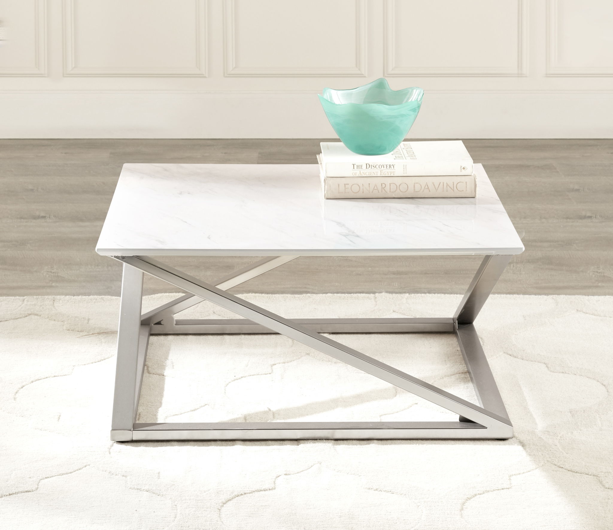 A mixed media table collection with a clean contemporary style, Zurich features a knife-edge faux marble top with an asymmetrical metal base that is as interesting as it is functional.